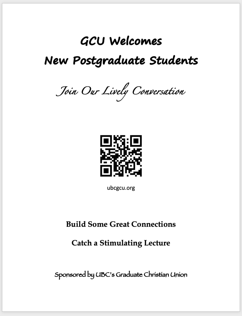Don’t let grad school make you cynical. GCU and GFCF are in pursuit of moral and intellectual goods, in pursuit of truth, beauty, wisdom and goodness. We are rooted in a strong consciousness of transcendence, combined with incarnational relevance (faithful presence). We are an ongoing conversation that has existed here at UBC for three decades, building out from a core position of faith, hope and love. We seek to build constructive community networks of like-minded scholars and scientists. We mentor, inspire and resource students.